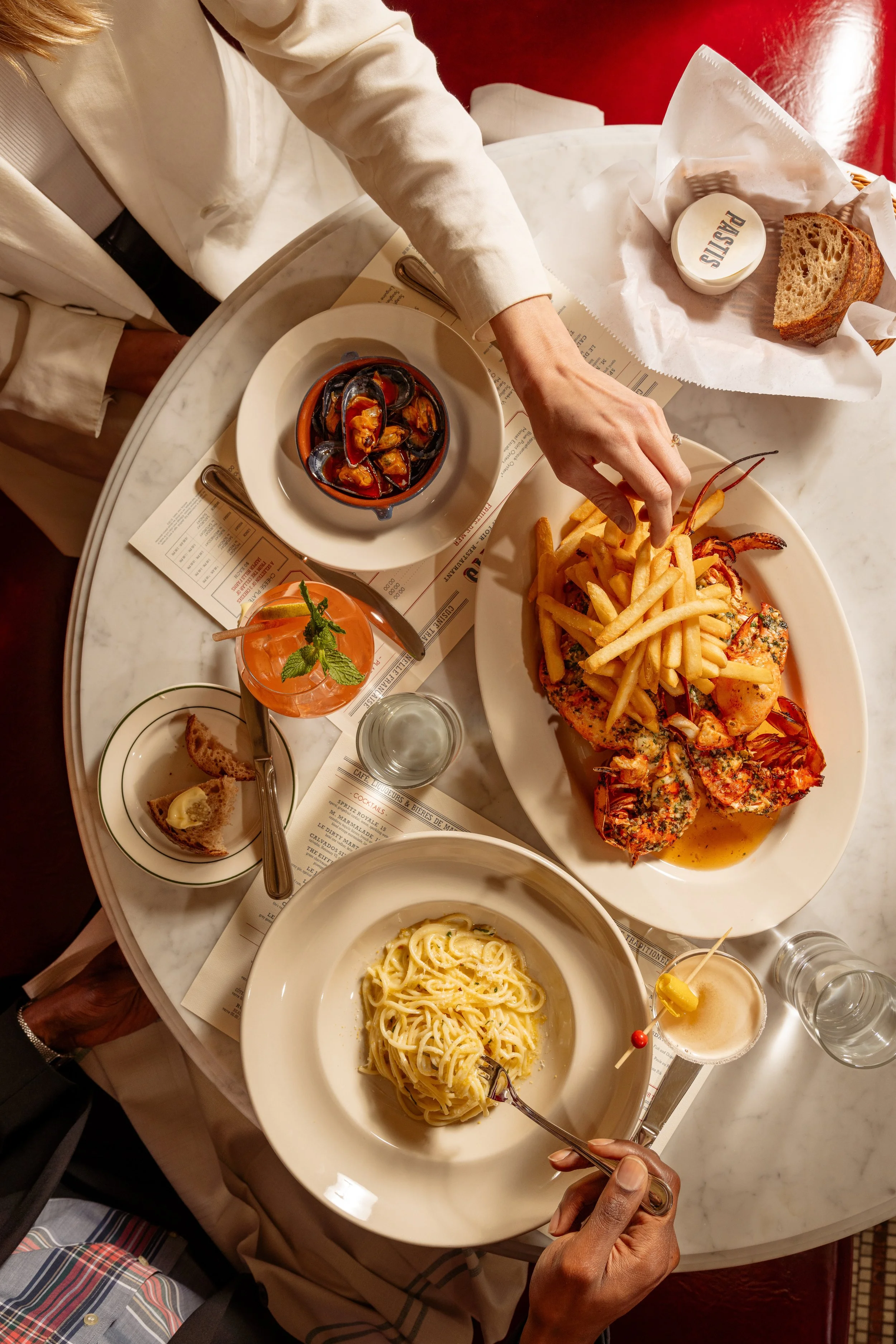 Overhead view of a marble table with seafood and pasta dishes, including lobster with fries, mussels, spaghetti, a cocktail, a drink with mint, and bread in a basket.