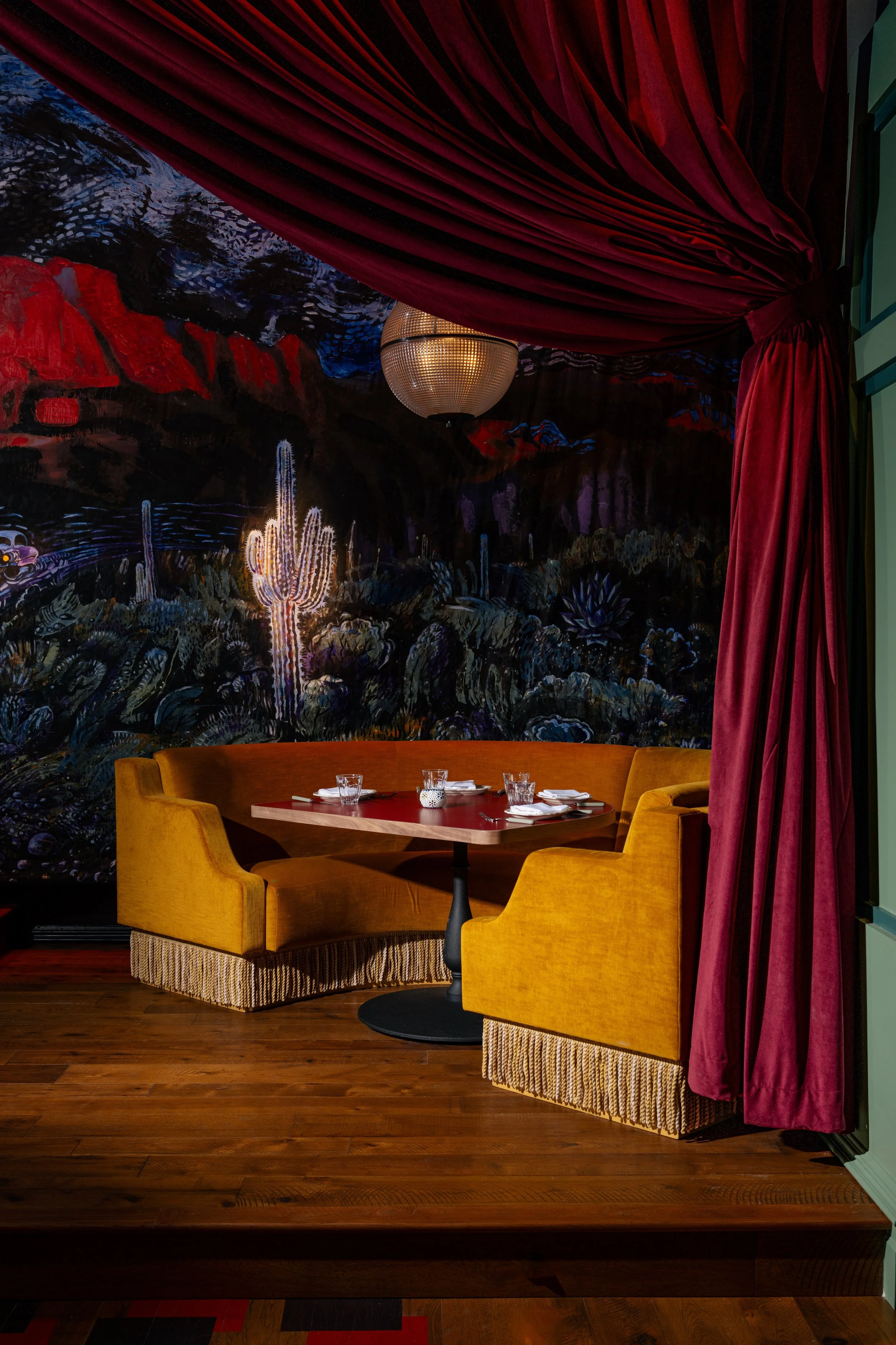Cozy restaurant booth with mustard yellow chairs and wooden table, red velvet curtains, desert-themed mural backdrop, and dim lighting.